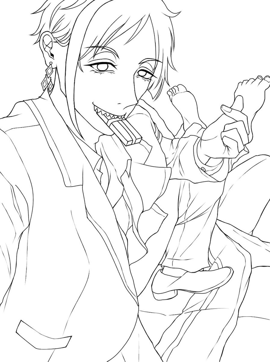 バレンタインの日マジカメで # 校内で唯一彼女持ち # バレンタイン戦争勝利 # 血糊はフェイク♡ などのハッシュタグいっぱいつけて死屍累々を踏みつけながら🦐から貰ったチョコ咥えて自撮りする🦈さんを描きたかったけどモチベがZEROなんで良かったら塗り絵にしてください。(フロ監) #twstプラス