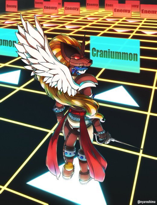 戦士であり策士/ドゥフトモン デジ文字にするか迷ったのですが、解読できない人にも背景の意味が伝わってほしかったので英語表記にしました🤔💦 ドゥフトモンなら英語も読めそう🤔💭 #絵師13人で聖騎士団 #デジモン #Digimon