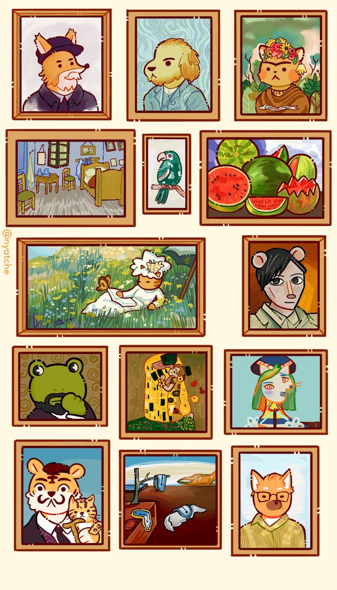 Quarta cartela do meu catarse assinaturas desse mês, com o tema de bichinhos x museu! Alguns pintores e algumas de suas pinturas~~ Garanta seu kit assinando até dia 31! catarse.me/nyatche