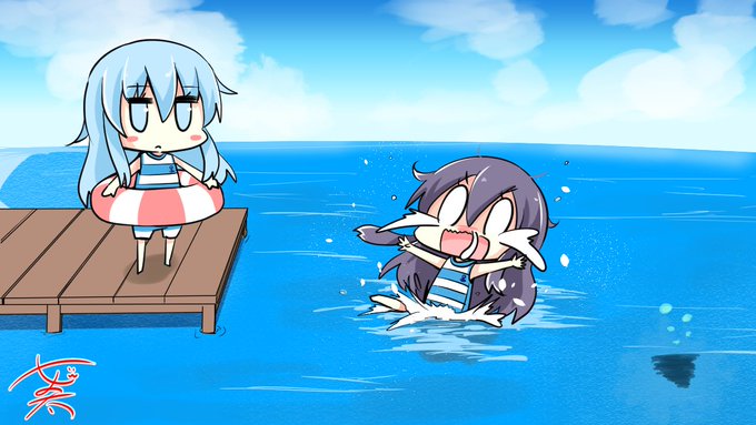 おはよう! こんな暑い日は海で泳ぎたいわね! でも、急に足をつらないように準備体操は入念にね! #艦これ
