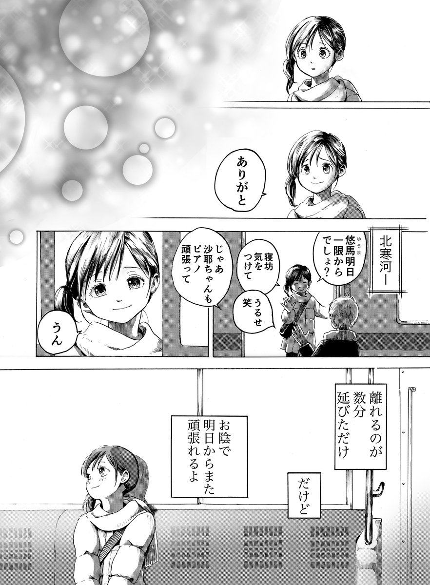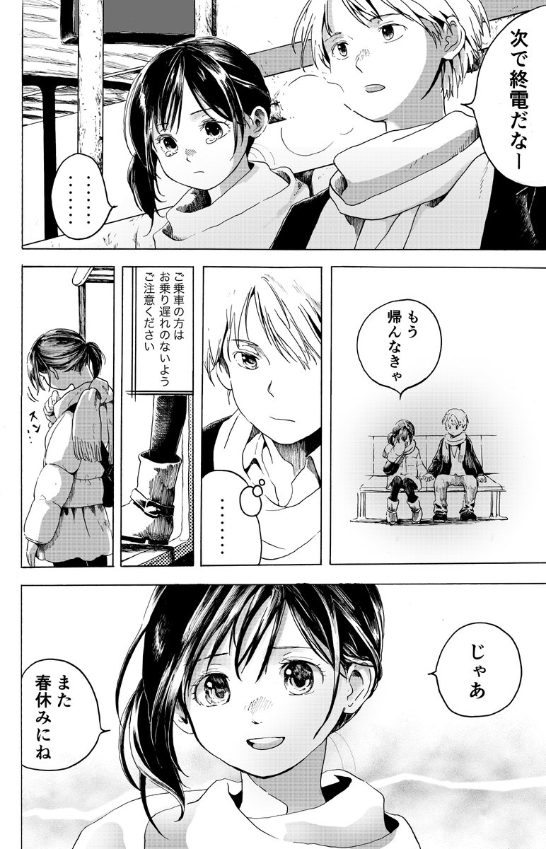 遠距離恋愛中の彼女が、帰りの電車を何本も見送っちゃう話です。 【冬休み最終日】 以前サンデーうぇぶり第8回新人賞4ページ部門賞の銅賞をいただいた作品です。文字フォントだけ読みやすく修正してあります。 #漫画が読めるハッシュタグ