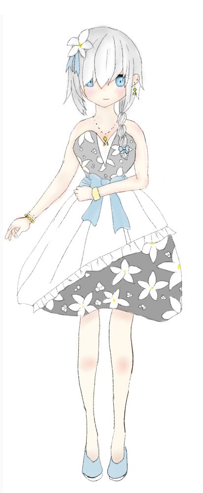 新衣装コンテストに出す勇気はないけど、ちまちまとケータイのアプリでここまで書けたから晒すー! 服が意外と上手くいったかな(*´꒳`*) 花はアルスの誕生日花のジャスミンをイメージしやした! #マル描いてちょんっ