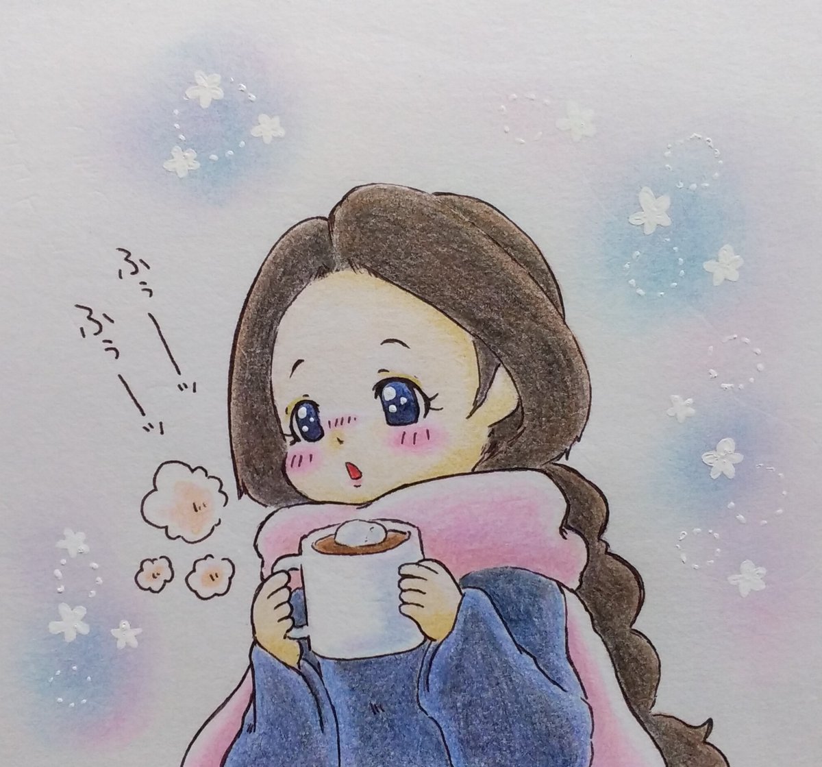#ブラボ #お絵描き #Gori03095578 『ほっと一息。』 Goriさんへ、 いつもお疲れ様です😄✨ 冷える真夜中、淹れたてのマシュマロココアを『ふ~ふ~』してくれるアデーラちゃんを描きました。 風邪引きやすいので、お身体に気を付けて下さいぷぇ~ッ😆💦