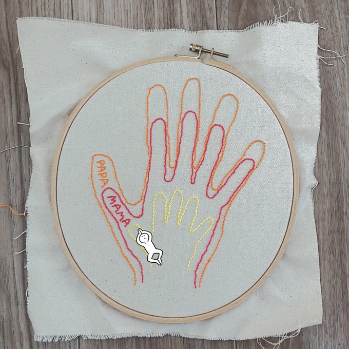 パンチニードルはとってもたのしい! この手形の刺繍はパンチニードルで作りました🤲 twitter.com/arimama_umauma…