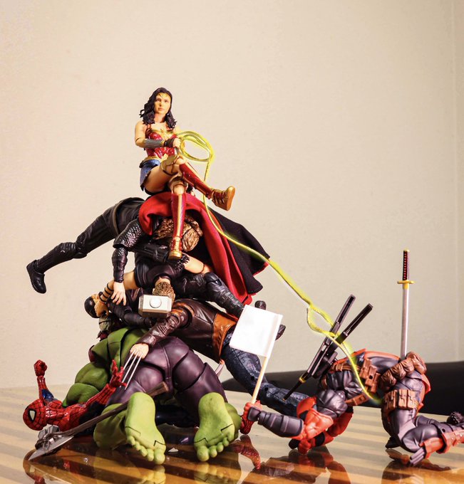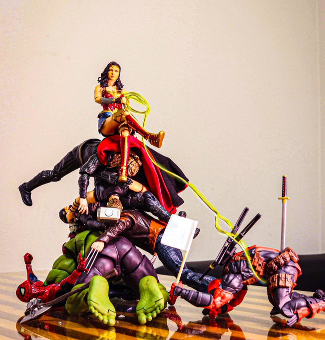 #marvelフィギュアコレクション テーマ【クロスオーバー】 marvelヒーロー 🆚 DCコミックス代表 ワンダーウーマン デップー『白旗です 降参です 俺ちゃんのお尻が』 #マーベル #DCコミックス #ワンダーウーマン #アメイジングヤマグチ #デッドプール #フィギュアーツ #オモ写