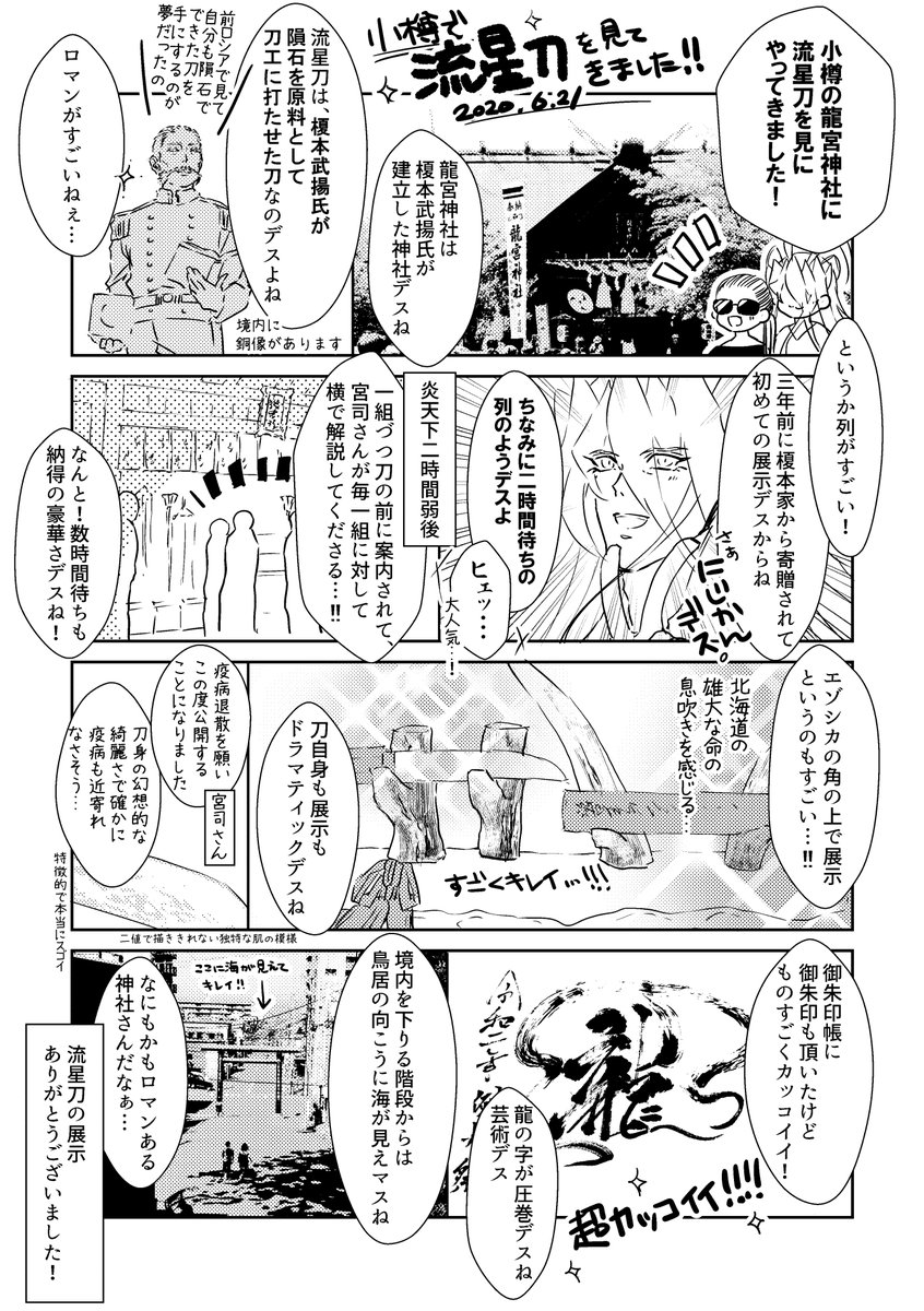 90 157 小樽の龍宮神社さんに流星刀を近侍の村正ちゃんと一緒に見に行った時のレポまんがです!! すごくキレイな刀でした…! 20/07/18 21:51