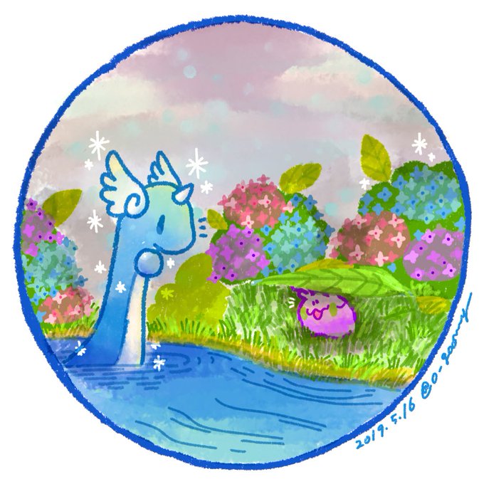 18 56 ハクリューとヌメラもかわよいの🥳🌱🌱🌱 ヌメラちゃんキラキラした美しいハクリューに 興味津々🥰 #ポケモン版深夜の真剣お絵描き60分一本勝負 19/05/17 00:51