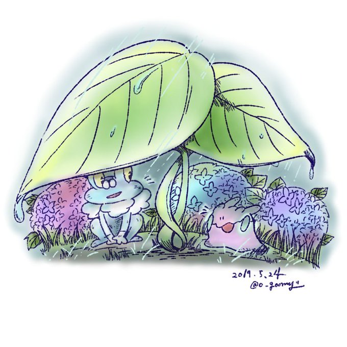 [ 相合い傘 ] ケロマツ「おや、きみも雨宿り?」 ヌメラ「きぐうだね~!」☔🐌 #ポケモン版深夜の真剣お絵描き60分一本勝負