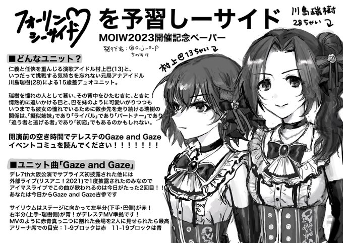 明日こちら(引用先)でGaze and Gaze用のサイリウム配布します! フォーリンシーサイド予習怪文書ペーパー持ってくのでよければサイリウムと一緒にもらってください。 サイリウムはデレステMV通り🟥🟦で真っ二つになったら最高…ですが、とにかく赤と青!なことだけでも覚えてもらえたら嬉しいです🌊 twitter.com/tomoe_club/sta…
