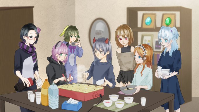 50 440 50人クラフトの女性陣(鈴木姉さん、かきかまさん、ゆいなさん、いけこさん、あいさん、ロゼックピンさん、のるのるさん) でタコパをさせました。 濃厚接触はイラストで済ませましょう🥰 #50人クラフト #50人イラフト #かきひめあーと #ゆいなちゃんのやつ #いけこあーと #ろぜあーと #絵ーあい 20/04/04 13:51