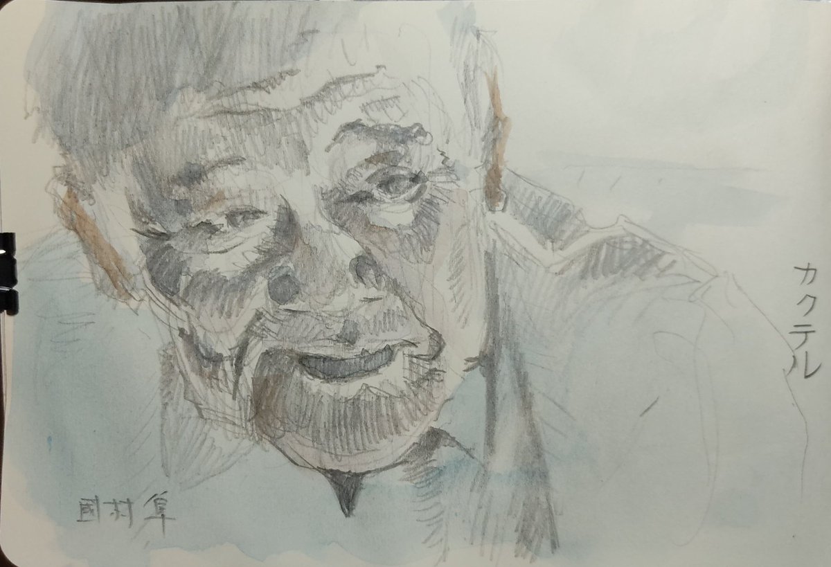 動画スケッチ 「願いのカクテル」というホッピーがつくったショートムービー。不覚にも涙。もうこういう歳だ。母は生前、夫婦は相手を看取ると約束した間柄なのだと言った。父を見送りながら。描いてみて國村隼の顔の皺が、あまりに饒舌で驚いた。 #透明水彩研究会 #スケッチ #watercolor