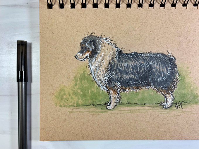 A late start for my #inktober but I’ve been swamped so I’m going to set a goal for about 10-15 illustrations this year. Here is a vintage little Aussie pup illustration on 5x8in tonal paper #inktober2021 #artist #australianshepherd