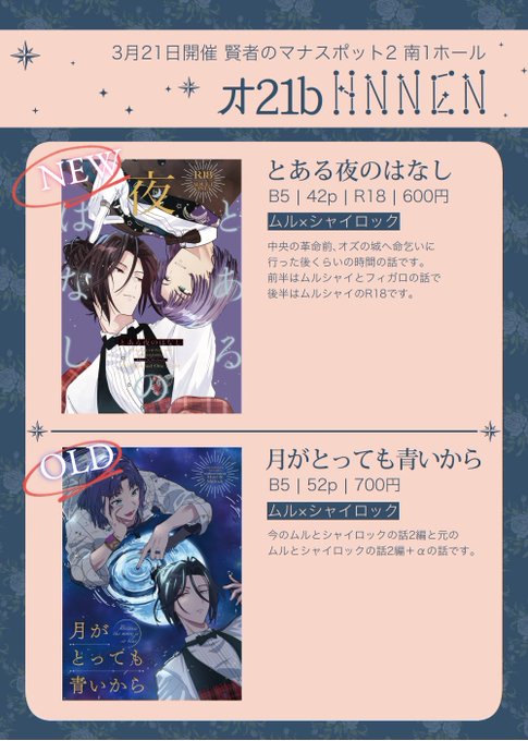 3/21 賢者のマナスポット2のおしながきと当日のポスターです参考にどうぞ 頒布物は新刊と既刊の二種です ムルシャイ新刊サンプルは引用リツイートをご覧ください twitter.com/oboro10/status…