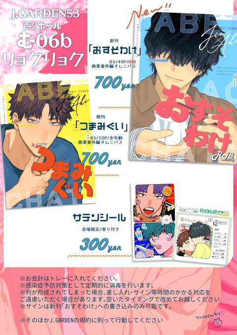 #JGARDEN53 おしながき | 小畑つねちか 🌸む06b『リョクリョク』 出口近くの誕席です🙌 頒布物3つです🙆♀️ 全て #食べたくなっちゃった 商業番外編になります 詳細はpixivを必ずご確認ください🙇 pixiv.net/artworks/10663… #創作BL