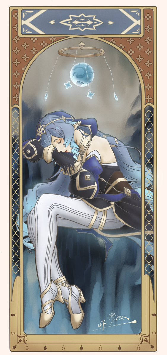 (Whisper) "Happy birthday to Layla~❄️✨ Wish you have a good rest today." Picture referencing Alphonse Mucha's Evening Reverie (1898) and Study for 'The Moon' (1902) Art by - White Radish #原神 #Genshinimpact #genshinimpactfanart #Layla #レイラ #レイラ生誕祭2022