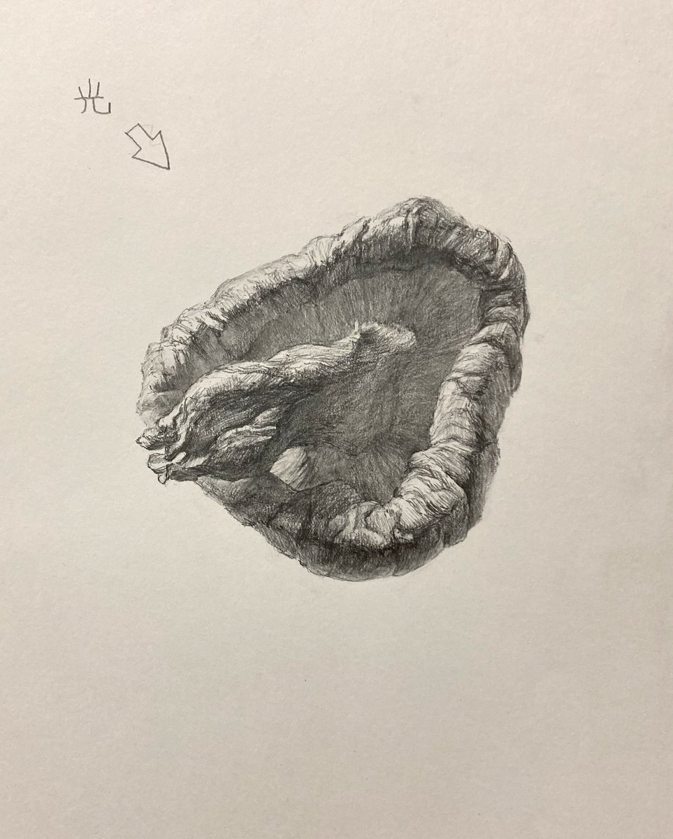 工芸の鶴田です。 レンブラントは、陰側の目の下にできる小さな光を、とても大事にしたという。 私は、モチーフを描くとき、 レンブラントの絵にあるような「小さな光」がどこかにできないか、探すことが多いです。 先日、干しシイタケを描きました。 そこにも「小さな光」を見つけました。