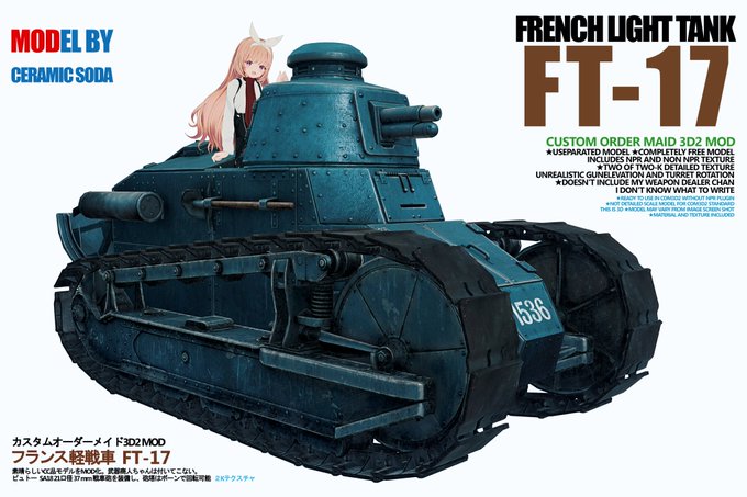 ろだにRenault FT-17 軽戦車modを上げました!🇫🇷🗼🥖🎨✨これで厳しい夏を乗り越えよう!🌺(*'ヮ'*)🌴 NPR無し版とNPR版入りのお得パック!!! 砲塔にボーンが入ってるので回せます🦴 ろだパスはいつも通りプロフへ☭ #COM3D2 ux.getuploader.com/Chanomiya/down…