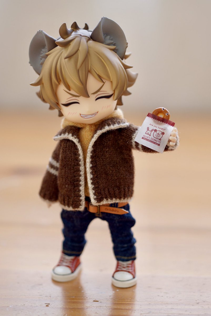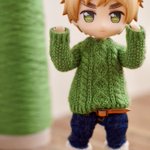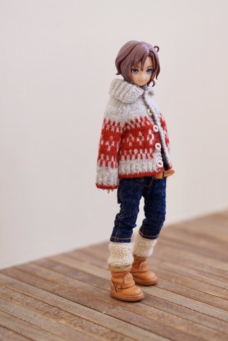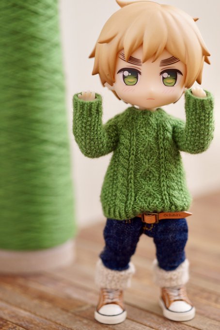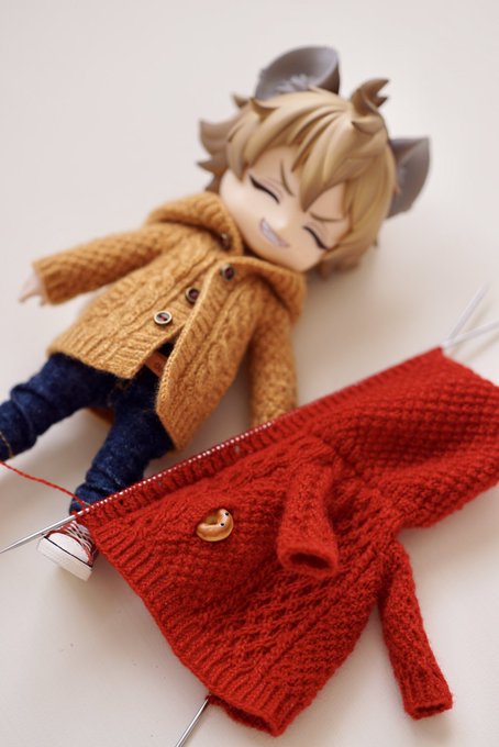 (まだ縮絨→乾かしたてでアホ毛もふもふしとるけど) いつもこのサイズん時は2plyを1plyにして編んどった糸を2plyのまんま編んでみたらコレはこれでなんか可愛いなおい😳 #ミニチュア #編み物 #ねんどろいどどーる 身長調整セット装着 ちなみにパンツの方は1plyにして編んだヤツです。