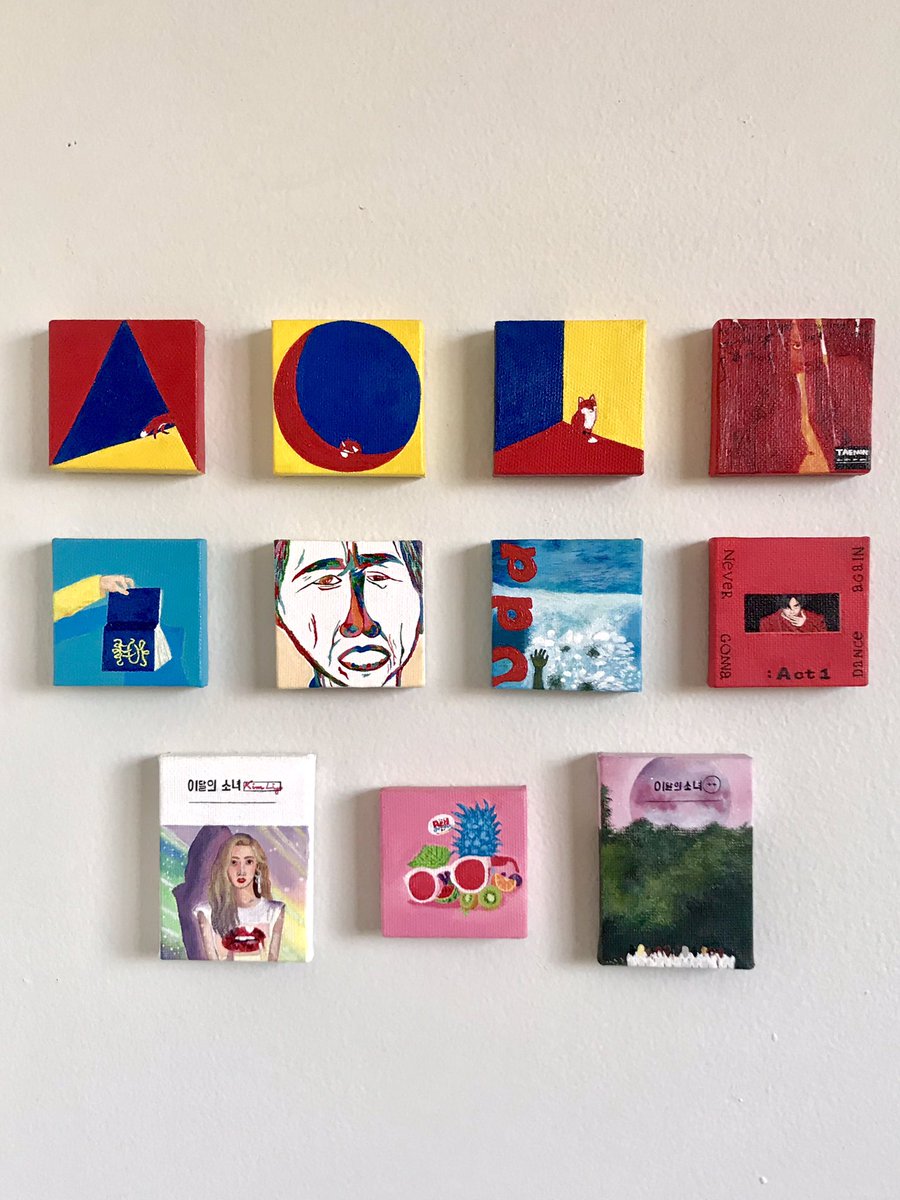 “Triptych of Jungeun in Nature,” acrylic on canvas and wood, 11.5 x 5.5 in. 🌿 #loonafanart #김립 @loonatheworld