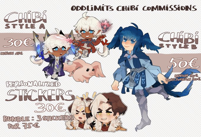 RT APPRECIATED 🫰 MAY / JUNE COMMS Heya ! All my commissions are now available on Vgen, with now chibi and sticker comms ! Regular slots open : 8 Chibi/stickers slots open : 15 VGen : vgen.co/oddlimits_ #Vgen Extra info below