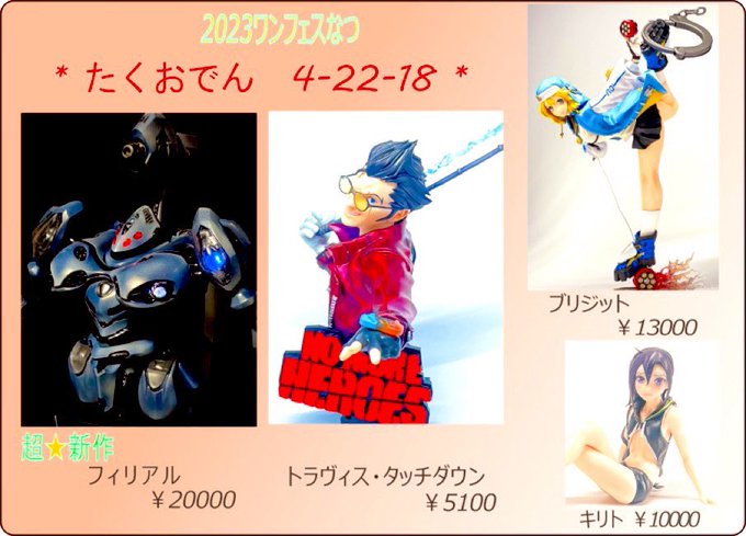 #WF2023Sおしながき #WF2023S ・新作 アーマド・コア2:フィリアル NO MORE HEROES3:トラヴィス ・再販 GUILTYGEAR-Strive-:ブリジット ソードアートオンライン:キリト キット詳細はそれぞれのツイートを確認ください 卓にある商品名ふせんを渡してもらう販売方式にしております よろしくです!!