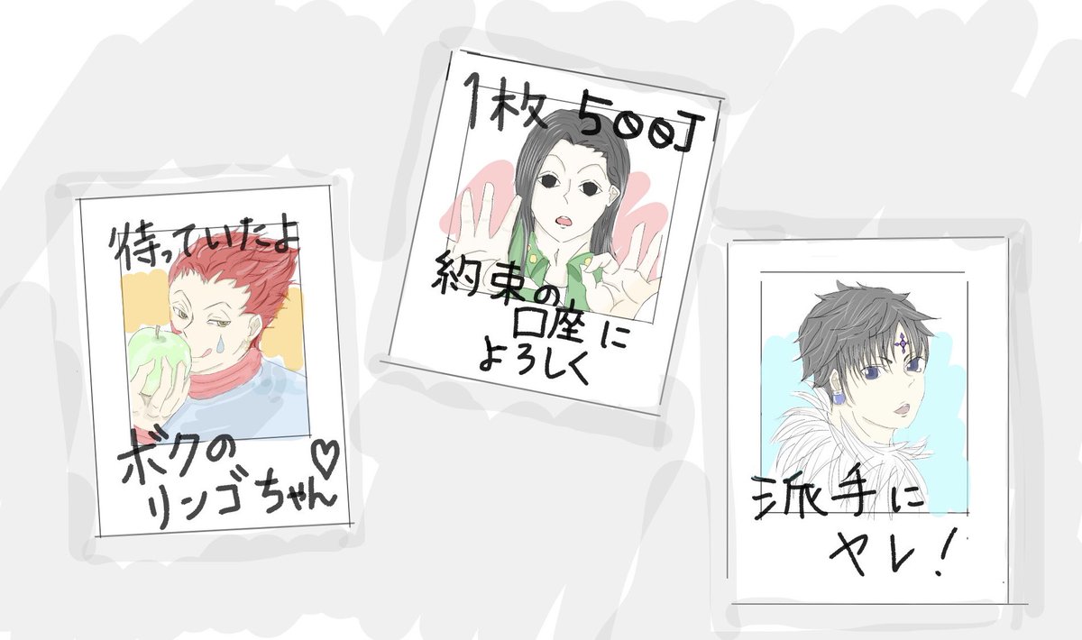 ライブグッズ チェキ(500円くらい)ヒソカ イルミ クロロ #hxhfanart #hxh 私が中学生の頃くらいにはライブで手書きで文字書いてるチェキを売ってました😳今でもそういうバンドあるのかな?