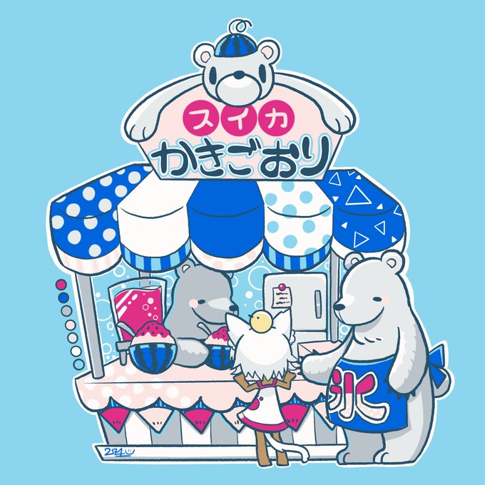 お絵かき夏のお題 『かき氷屋さん』『スイカ』 この二つで描きました。 ロロロの肌とプゥン以外は、カラパレ作って塗りの縛り練習。 レイヤー効果無し、レイヤー3枚の軽い仕上がりに出来ました。