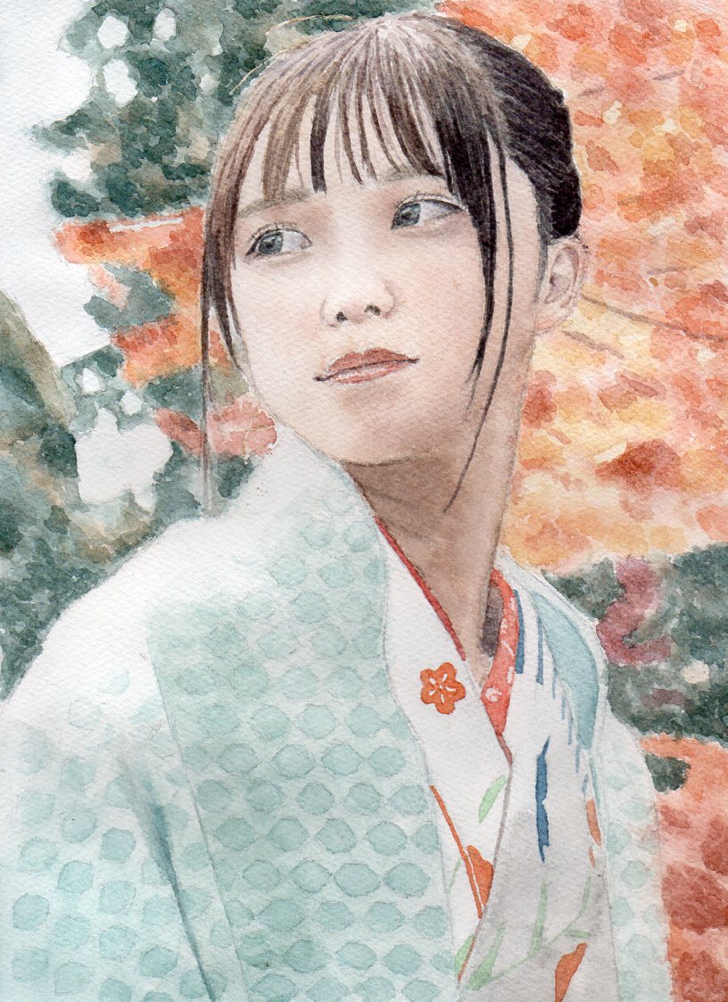 【秋と紅葉とはんなりと】 #水彩画 #透明水彩 #人物画 #肖像画 #気に入ったらRTしてね