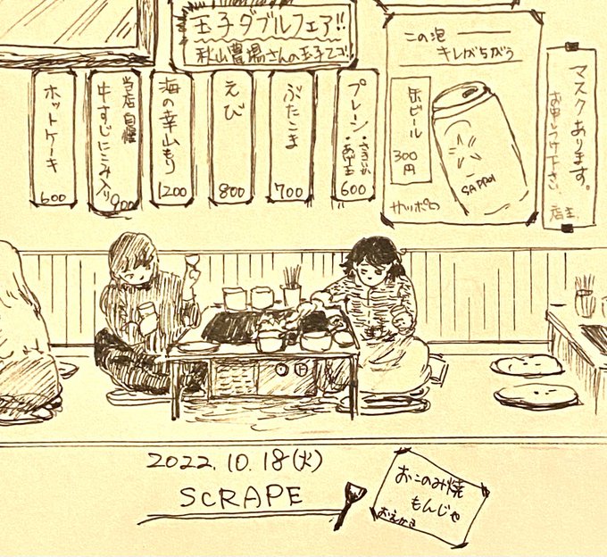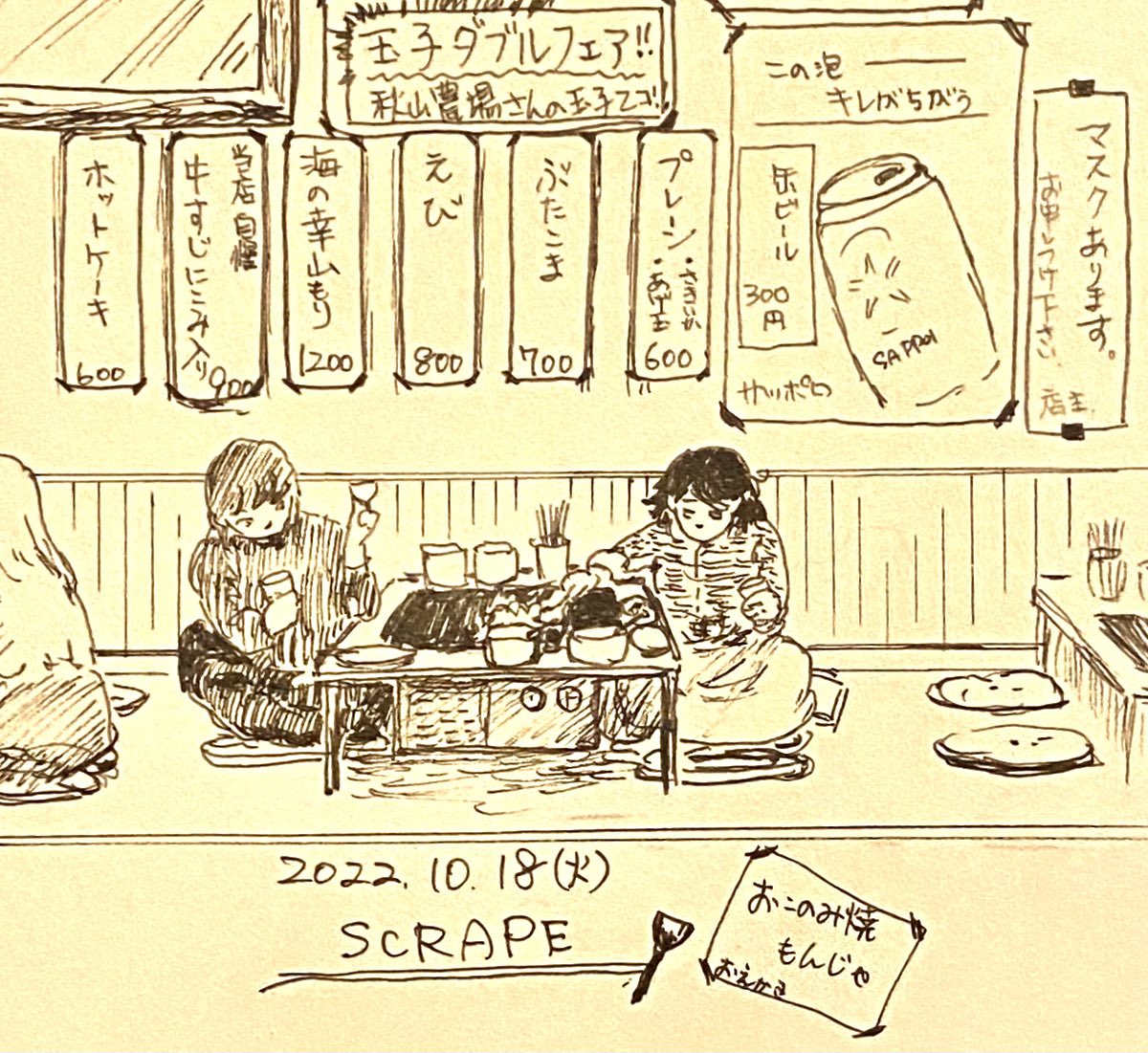 #インクトーバー2022 #inktober2022 #お好み焼き屋さん #もんじゃ屋さん #scrape 数年行ってない お好み焼きと もんじゃのお店。 缶ビールが そのまま出てくる。 (自分でプシュッとあける)