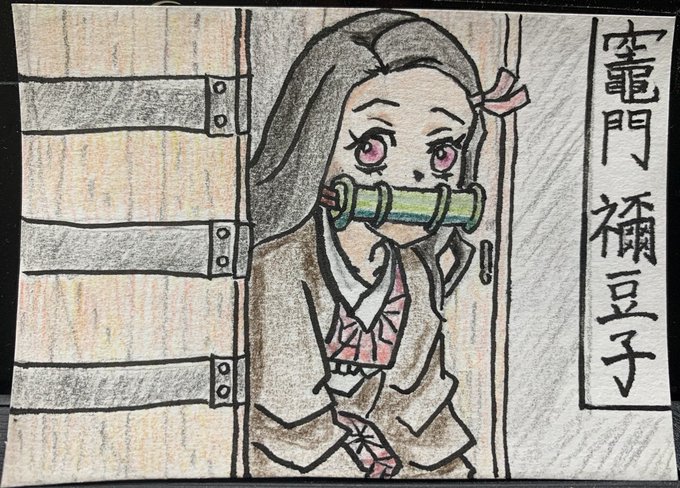 リクエスト絵#9「ねずこ」 #鬼滅の刃 #竈門禰󠄀豆子 #遊郭編見なきゃ #イラスト #筆ペン #水彩色鉛筆