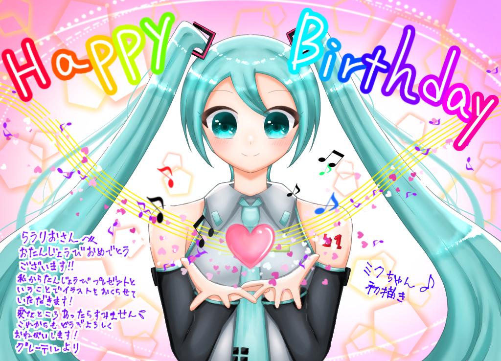 @masterNumber157 らうりおさんお誕生日おめでとうございます〜🎉🎉🎉 誕プレということでイラストを描きました〜♪ ミクちゃんともえぎちゃん(?)です!!