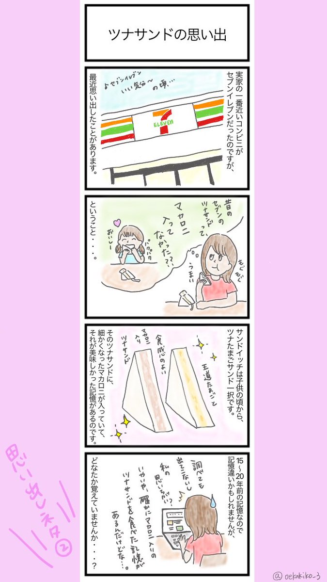 2 26 お久しぶりです、思い出しネタです!周りに聞いても誰も覚えていないというので真相は分かりませんが、今も昔もセブンイレブンさんのツナとたまごのサンドイッチが大好きです! #漫画が読めるハッシュタグ #4コマ漫画 #セブンイレブン #サンドイッチ #思い出しネタ #エッセイ漫画 21/10/06 13:32