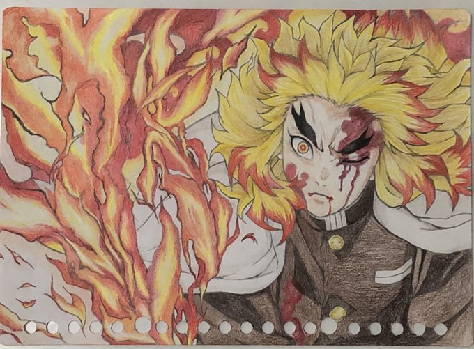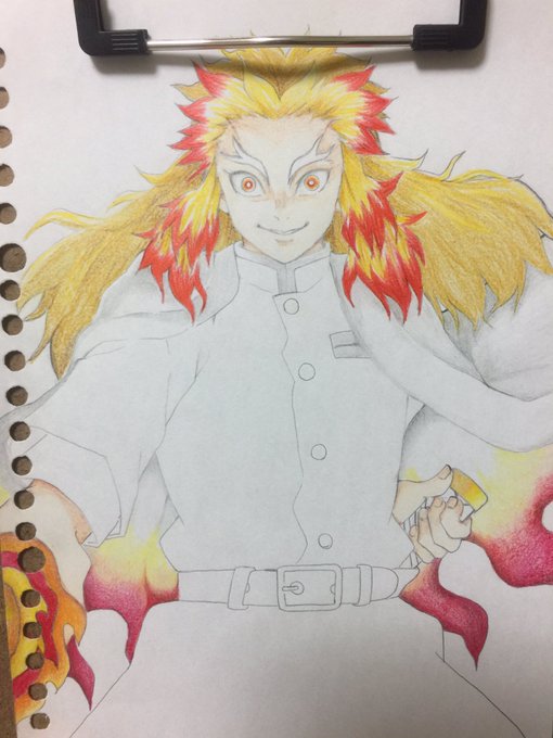 1 8 自信作です!(自画自賛) 煉獄杏寿郎 模写 『心を燃やせ』 煉獄さんはかっこよかー! #鬼滅の刃 #煉獄杏寿郎 #模写 #色鉛筆 #イラスト 21/03/29 12:53
