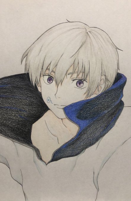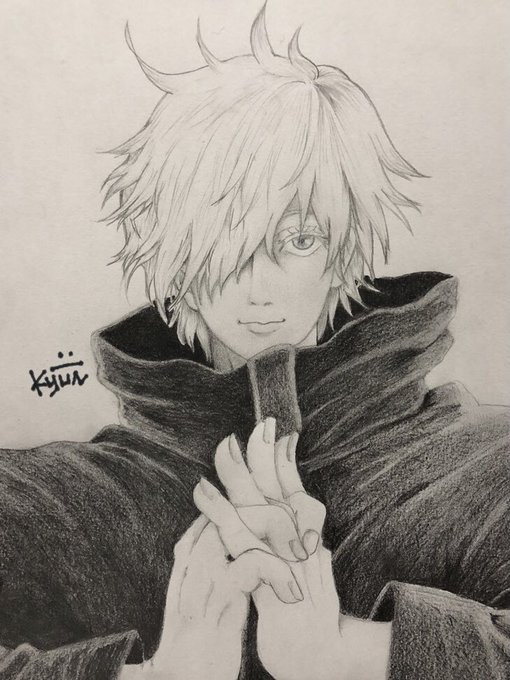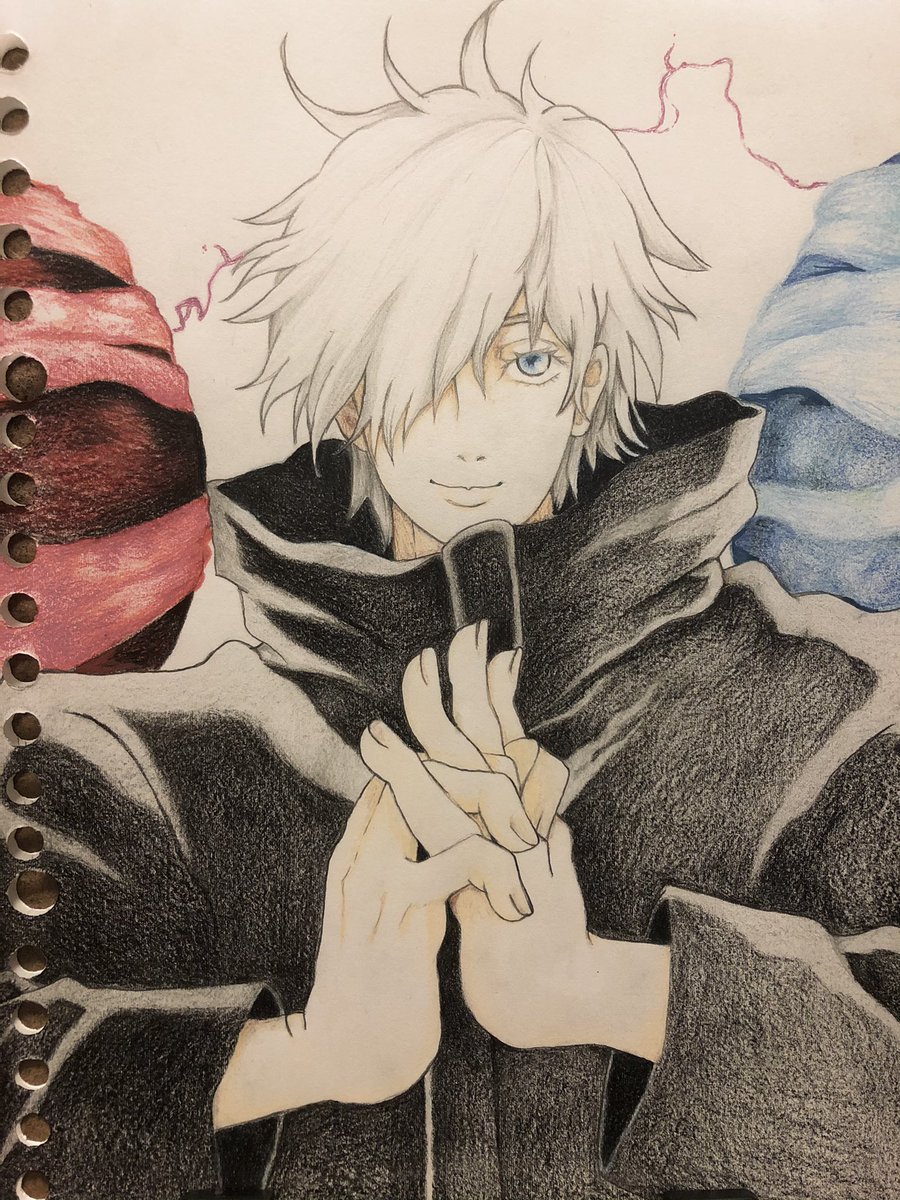 2 27 自分用のは鉛筆でモノクロに仕上げた( ¨̮ ) 五条先生ー!! 瞳だけ色鉛筆でほんのり青い …けど写メじゃ伝わらない!(笑) #呪術廻戦 #イラスト #鉛筆 #色鉛筆 #五条悟 21/03/09 13:58
