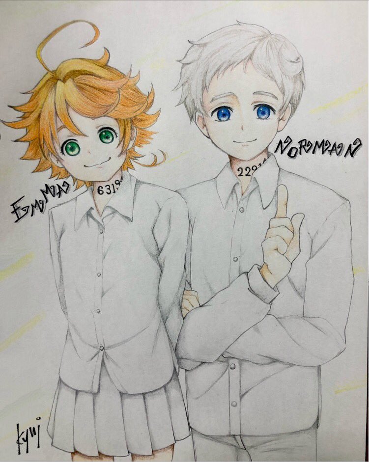 完成したよ! 約束のネバーランドより エマ&ノーマン 服が白なのでめちゃ早く出来た(^O^) チビちゃん1号のお友達のリクエストなので旅立ちます。 よろこんでくれるかなー? #約束のネバーランド #エマ #ノーマン #イラスト #色鉛筆