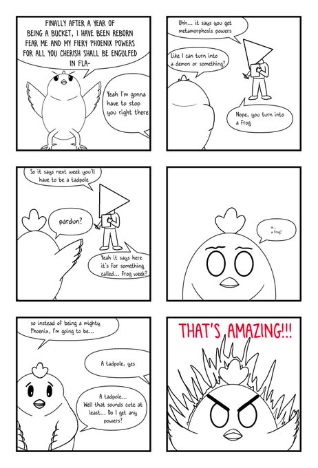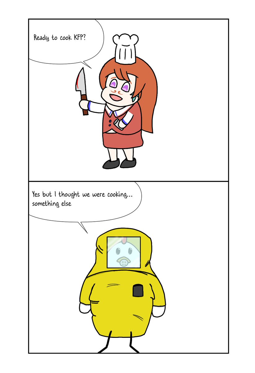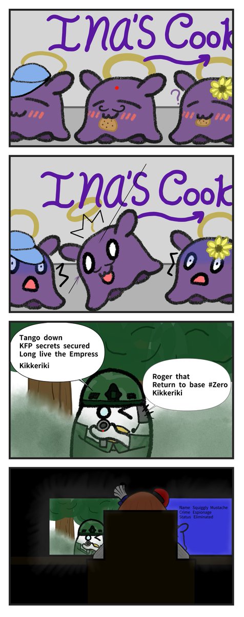 Context: in KFP there is an SC roleplayer named Squiggly Mustache who often talks about stealing KFP secrets and escaping to Mama Ina. Kiara once jokingly said to take him out (paraphrasing). Here's a joke response comic of #KFP taking him out #ArtsOfAshes #inart