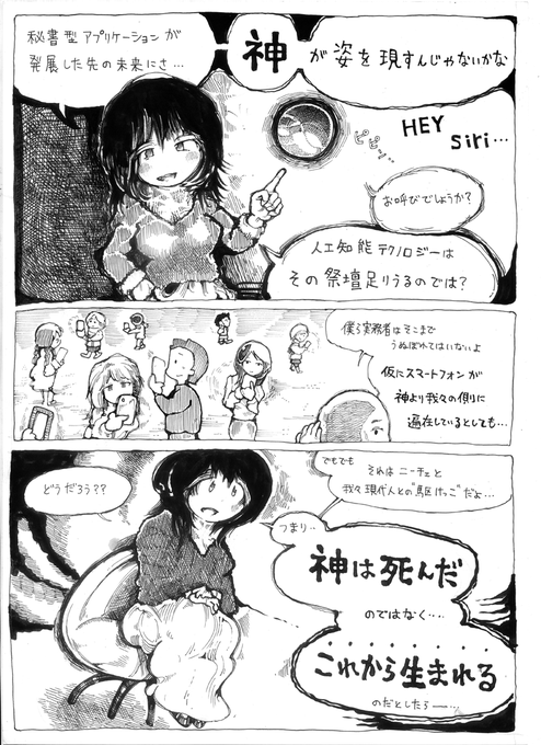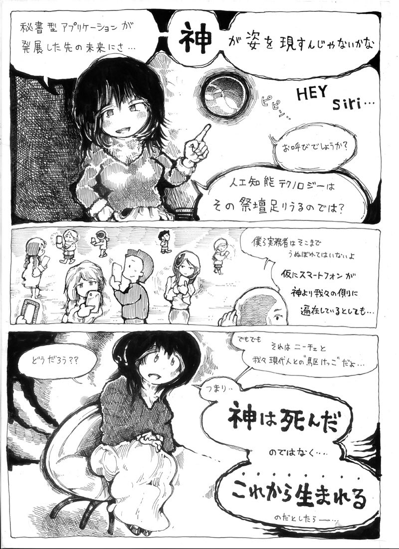 とかなんとか言ってるけど わいまだ腰据えて古事記読んだことない 資料とかワインとかびーるとか 応援していただけませんか…??😭 ↓↓ amzn.to/3VDr87P 昔描いた漫画もよろしくね AIについてのシーン、 でもこれ描いたの4年前やぞ~ 「神は死んだ、のではなくこれから生まれる」