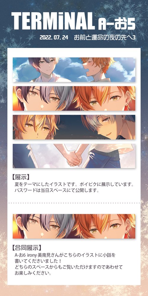 明日7/24 よるさき3のお品書きです。 A-お5 TERMiNALにてイラストを展示しています。 また、展示するイラストにお隣のスペースの美南見さんが小話を書いてくださいました! どうぞよろしくお願いしますー! #お前と運命の夜の先へ3 #よるさき3