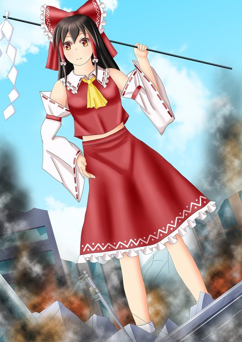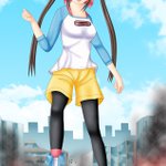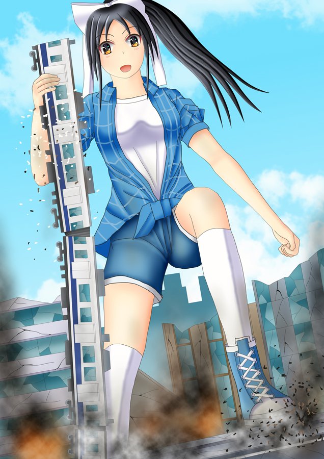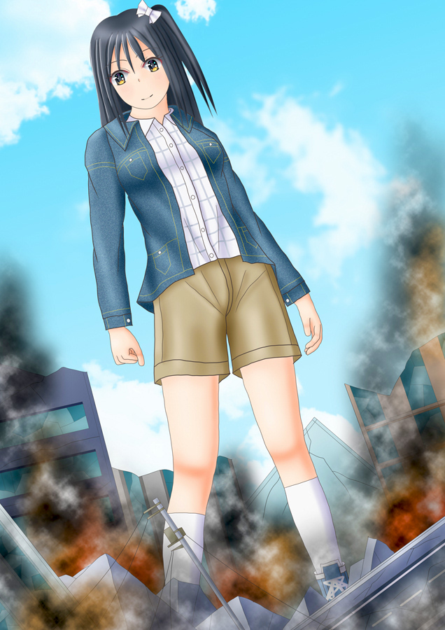 #自分の代表作だと思う絵を一枚だけ選んでみよう 街の中で派手に戦う巨大格闘少女・千鶴です。身長50メートル近い少女が戦うと、大きな街も簡単に壊滅しますが、怪獣相手ならば仕方ありません。 いずれはこれを超えるイラストを描きたいですね。