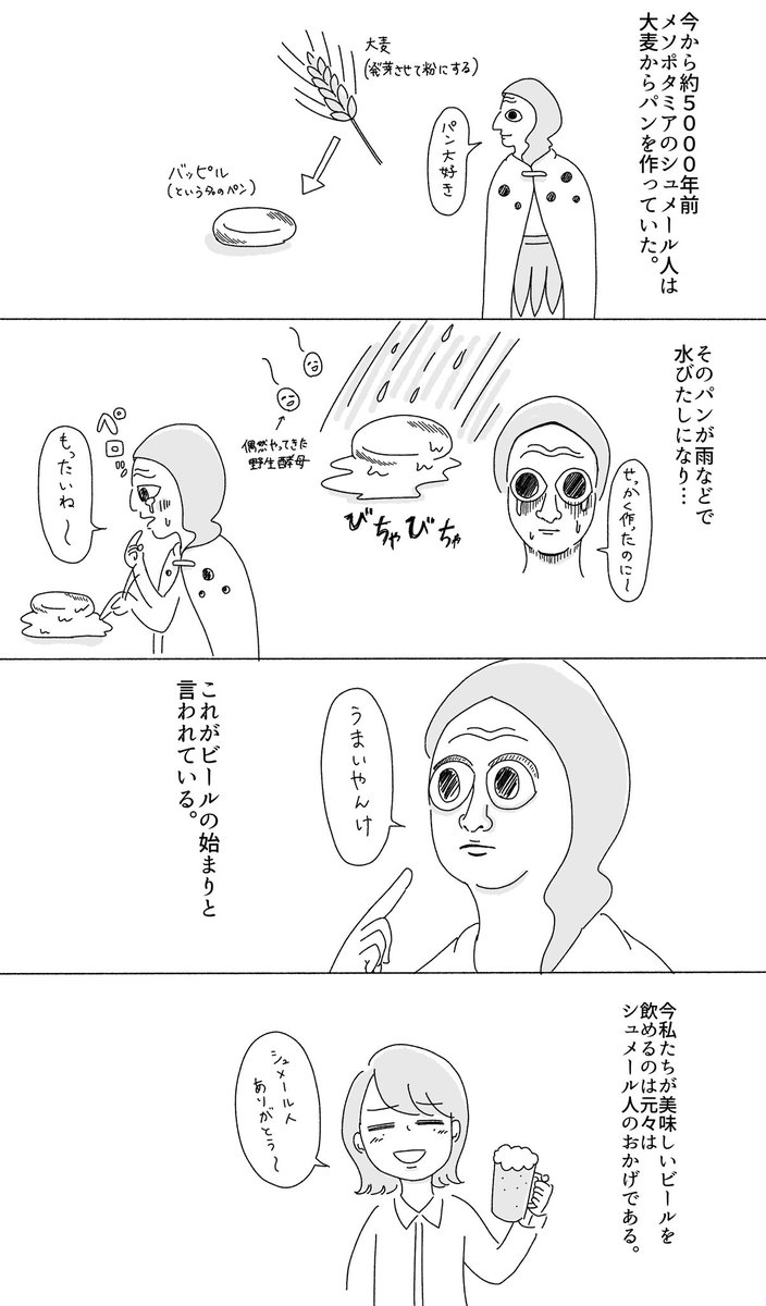 ここ数ヶ月、ビールの勉強をしていて面白いな〜と思ったことを漫画にしました。ビールのはじまりの話。私と同じ酒クズの皆さん読んでください。一緒にシュメール人に感謝しましょう。 #漫画の読めるハッシュタグ #ビール検定