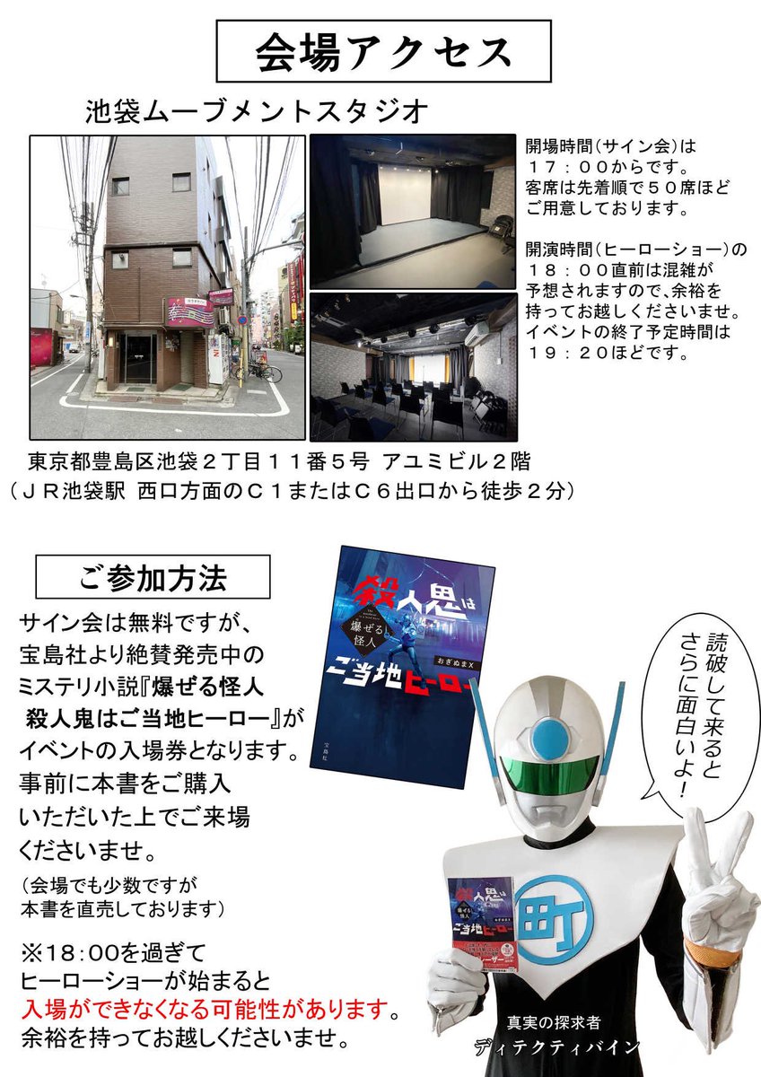 【特報】 6月25日(日)『爆ぜる怪人 殺人鬼はご当地ヒーロー』の 発売記念イベントを開催しますっ! ヒーローショー中に想像を絶する方法で死亡する関係者…… リアル謎解きヒーローショーサイン会の幕が上がる! あなたは、この謎を解くことができるか!? #爆ぜる怪人 #ヒーローショー殺人事件
