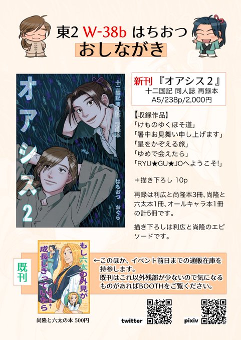 2019年の夏コミにて発行した同人誌『麒麟の嫁入り』(尚六本)をpixivにて全文公開しました!読んでいただけたら嬉しいです💐 自分で読み返してたら懐かしすぎて色々恥ずかしくなりました…笑 pixiv.net/artworks/10369…