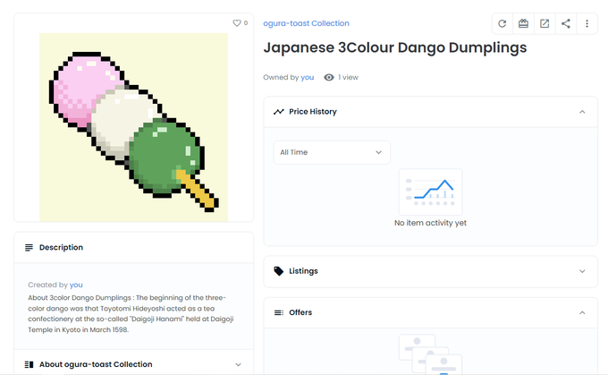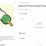 0 3 アカン!NFT初回出品にガス代かかるみたいで、ウォレットのお金足りねぇからまだ出品できん。チキショー!口座振替完了するまでお預けだけど、出品方法はわかったのと展示まではできた。作品は最近影響を受けた「ジャパニーズ3ショクダンゴ」#ピクセルアート #ドット絵 21/11/21 15:46