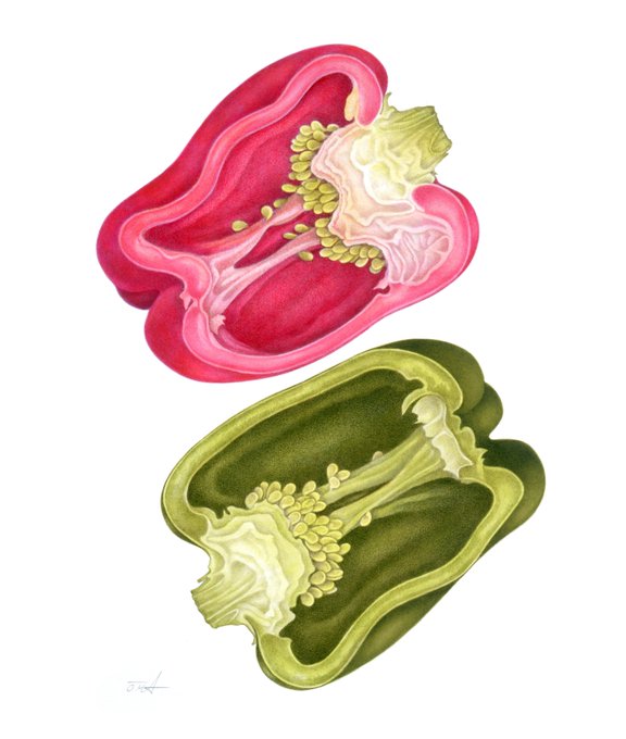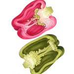 赤・緑ピーマン(red and green peppers) #大橋正 #tadashiohashi #水彩画 #watercolor #artworks #Illustration #graphicdesign #art #drawing #イラスト #グラフィックデザイン #絵画 #ピーマン #greenpepper #redpepper #断面 #西洋野菜 #アナログイラスト