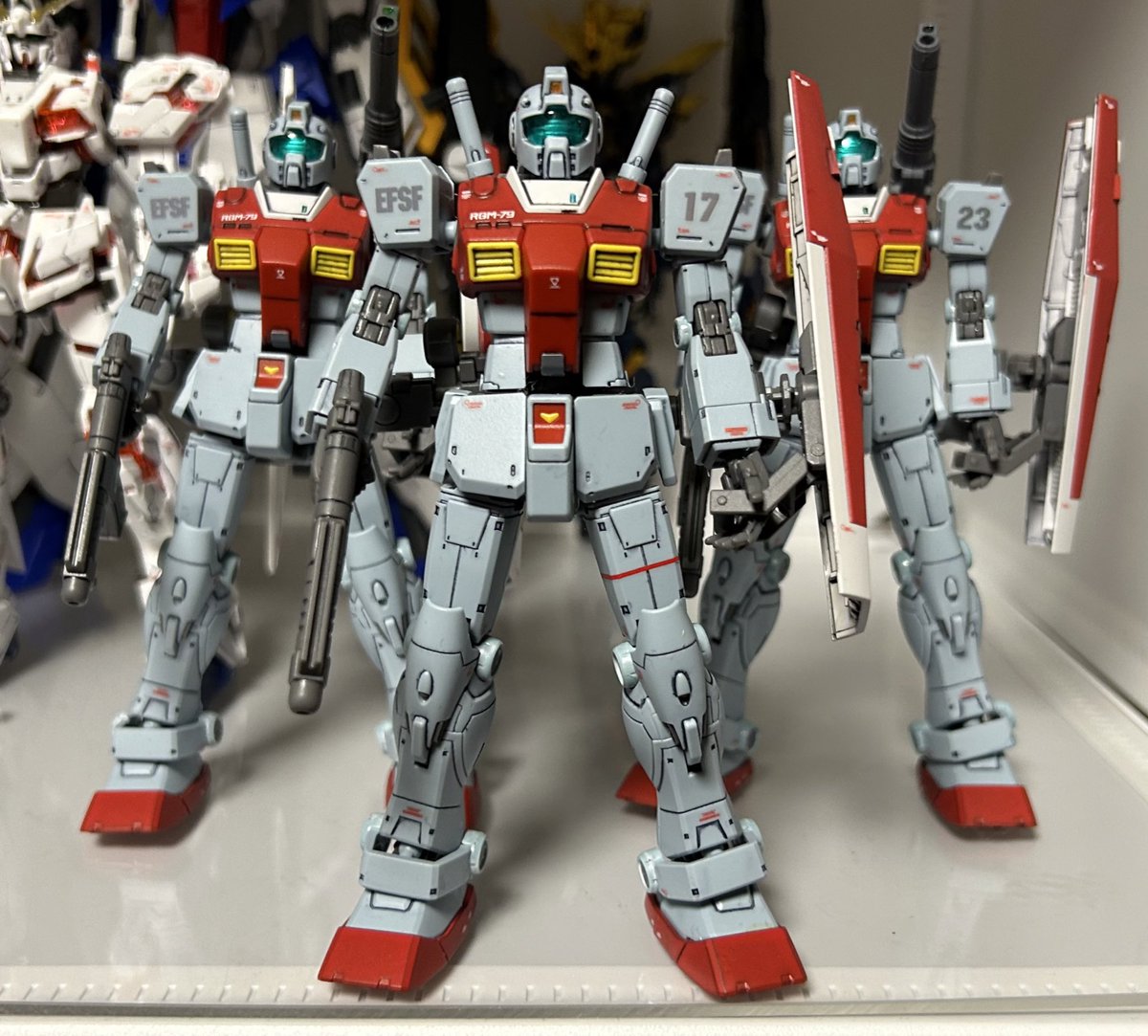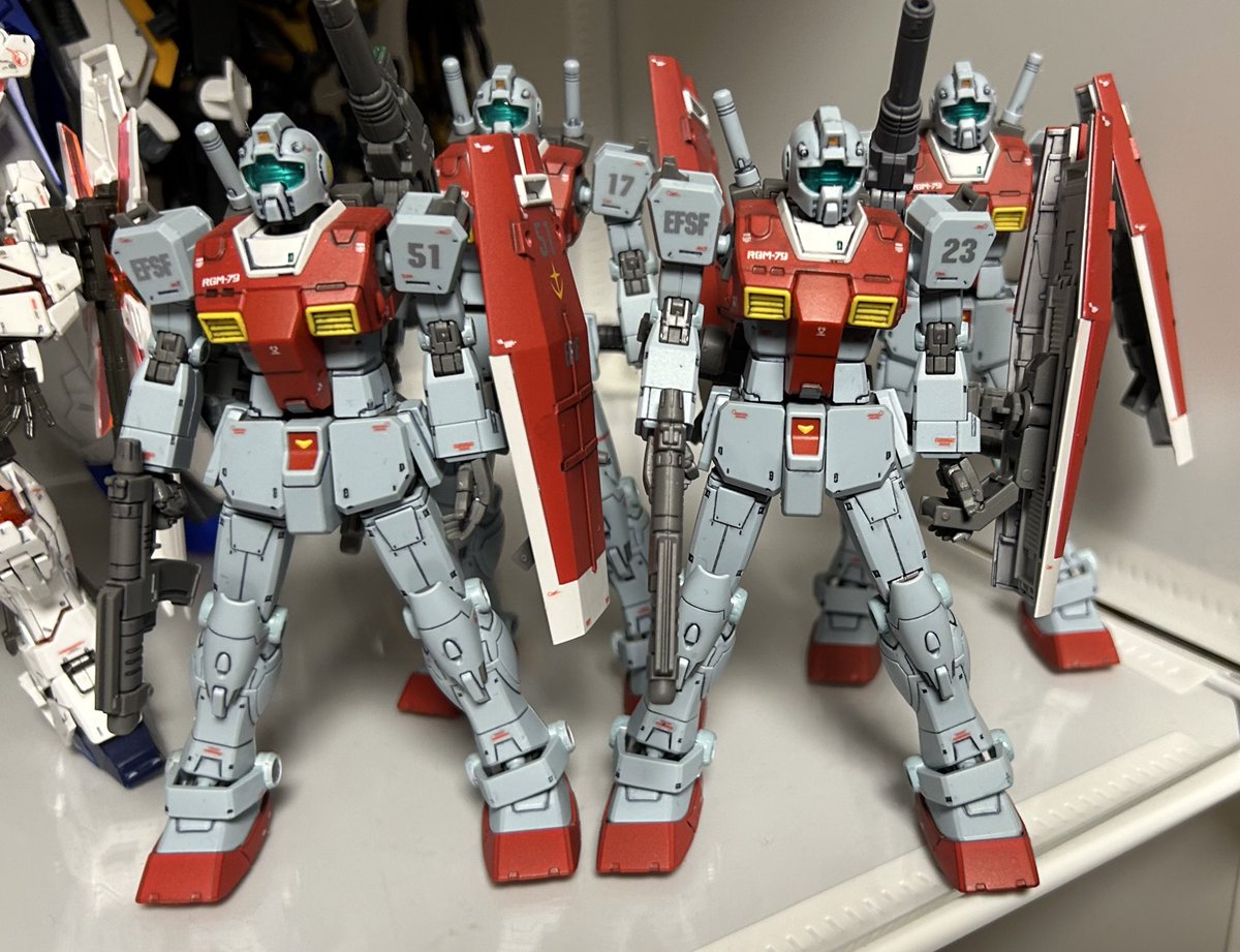 こんばんは。 HG 1/144 ジム (スレッガー搭乗機)を流用して、前期型素ジムを3機改良しました。 今日は各関節をボディー色にしました。 #ガンプラの画像貼るとRTされると聞いて #ガンプラ