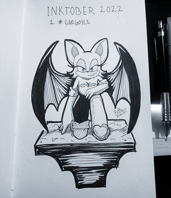 Retrasada pero intentaré reponerme! #rougethebat siendo una gárgola espiando a la gente desde lo alto 🖤 #inktober2022 #inktober #inktoberday1 #SonicTheHedgehog #furryart