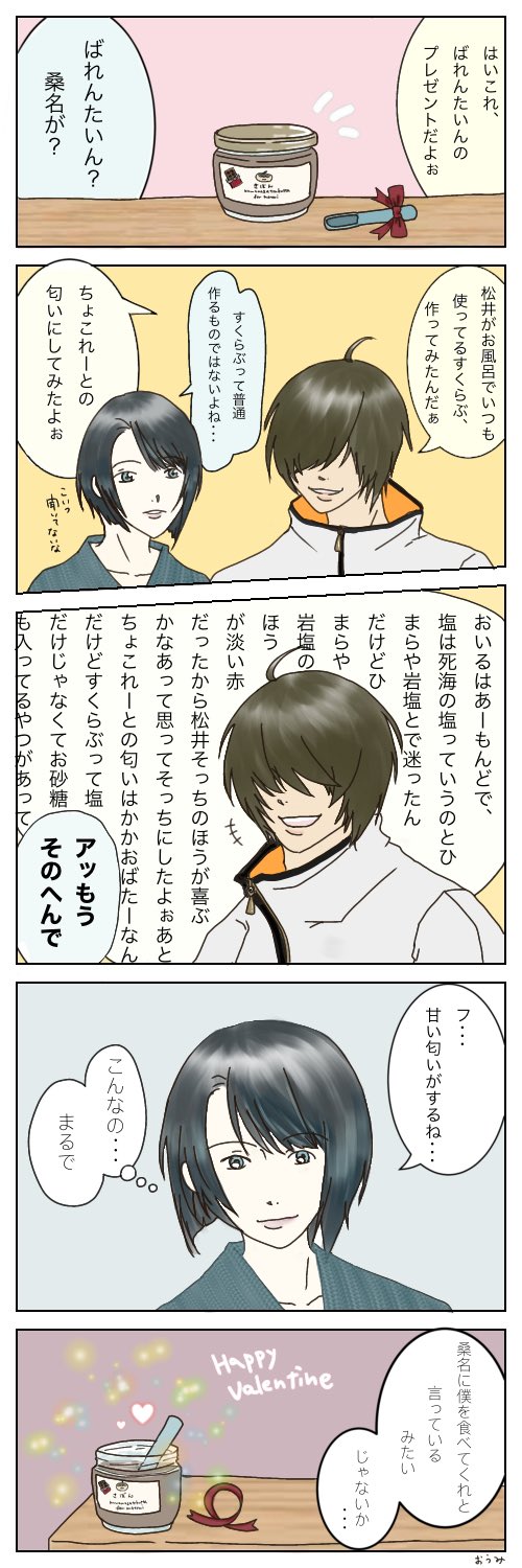 お題「手作りチョコ」 時間 3h #くわまつ深夜の創作一本勝負 去年から妄想していたまつい愛用のSAB◯Nを手作りするくわなの現パロくわまつを描きました くわながまついを食べたいって意味かもね