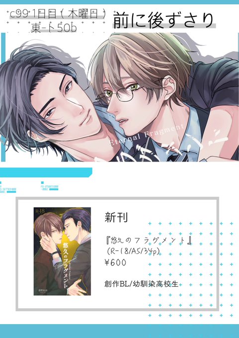 25 136 【C99 お品書き】 12/30 day1 東-ト50b 「前に後ずさり」にて参加致します❣️ 今回は新刊のみですが ポストカードが特典で付きます⭐️ サンプルは後ほど🎶 幼なじみ男子高校生の話です✨ (通販等現時点では未定です) 以下サンプル↓ #創作BL #C99新刊 21/12/27 17:46