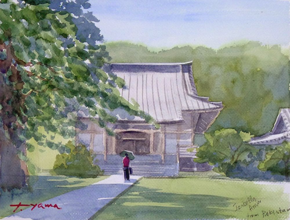 #水彩画 #透明水彩 #風景画 #スケッチ #Watercolor #Landscapepainting #Watercolorpainting #Sketch グループで #豊顕寺(#Bugenji 横浜市神奈川区)に出かけました。パキスタンから来た女性(#Isabella_Amin さん)がモデルになってくれました。左は #樹齢600年の銀杏 です。