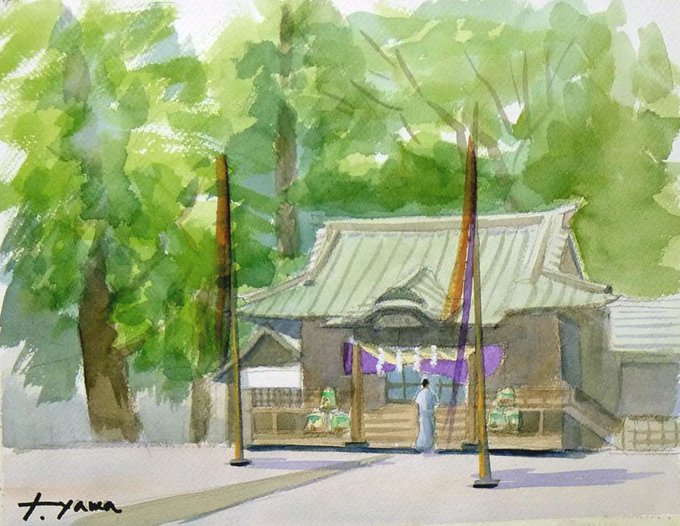 #水彩画 #透明水彩 #風景画 #スケッチ #Watercolor #Landscape #Sketch #描き鉄 始めました #描き鉄とは:鉄道で旅をしながら気に行った景色をスケッチ 趣味+健康づくりが目的 #寒川神社 本殿 威風堂々とした神社 JR相模線 #宮山駅 から徒歩5,6分 時間をかけずあっさり色付け